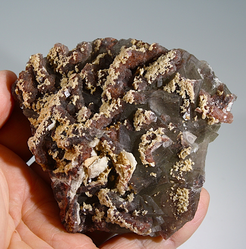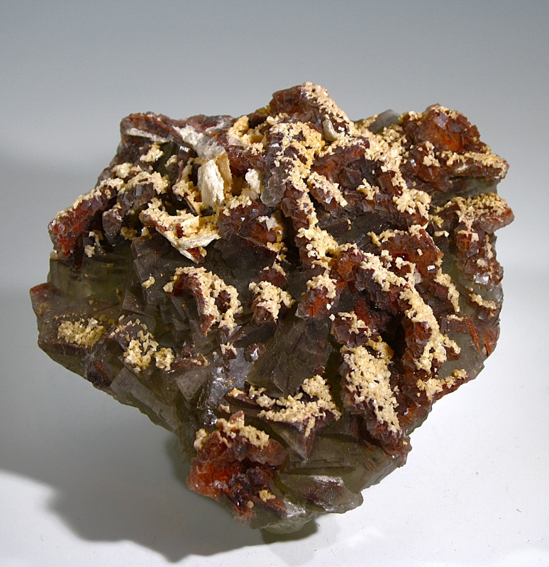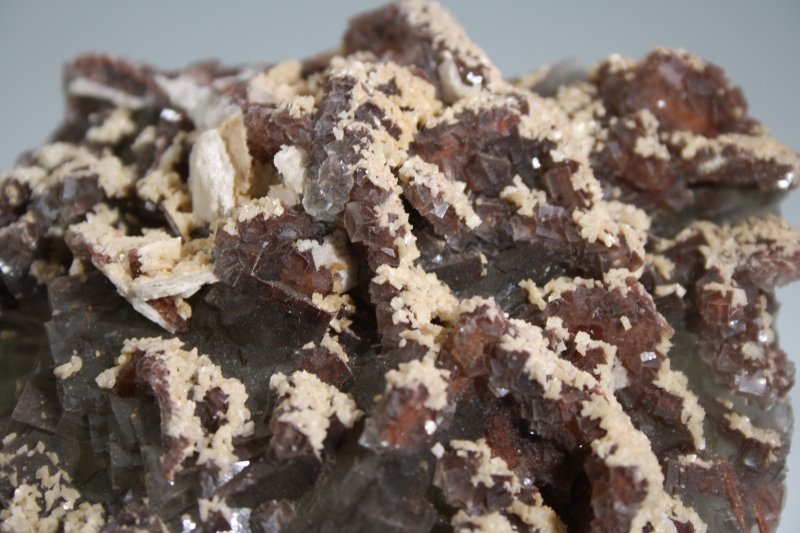 Dolomitkristalle sitzen auf kleinen rot durchscheinenden Fluoriten, die wiederum auf einer ersten größeren Generation Fluorit aufgewachsen sind