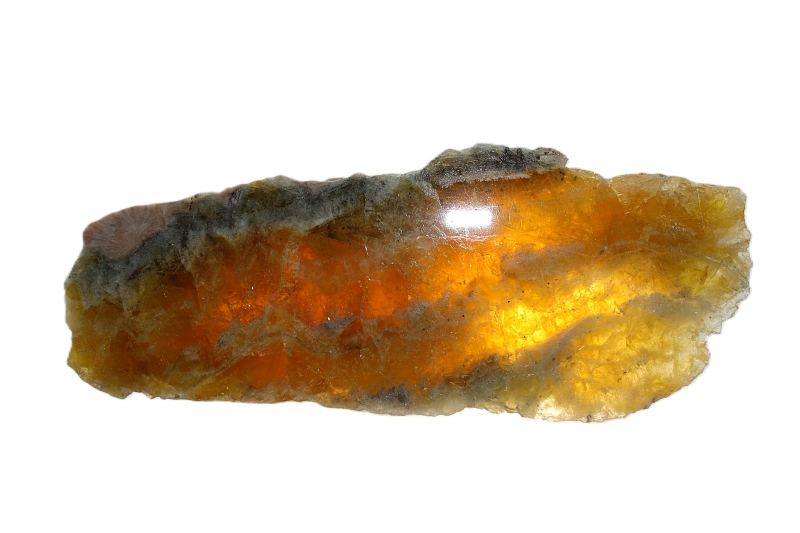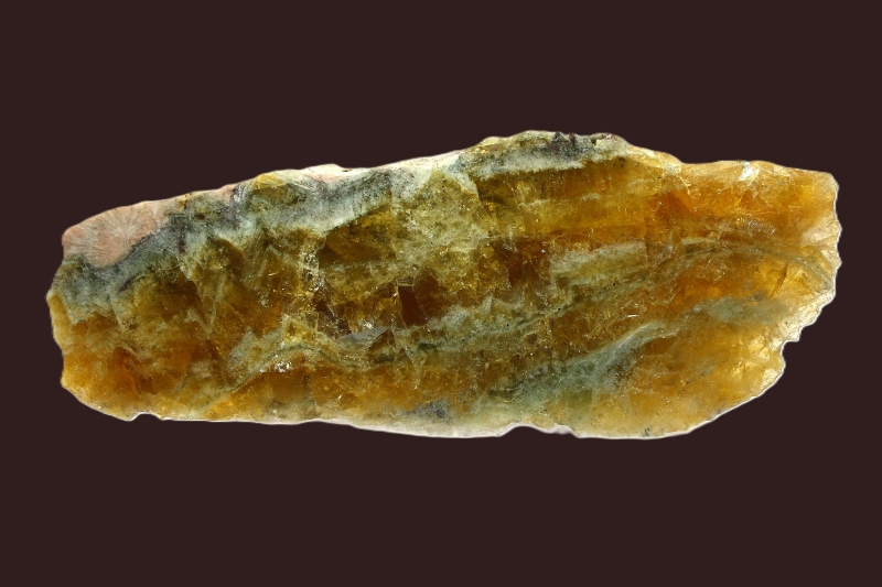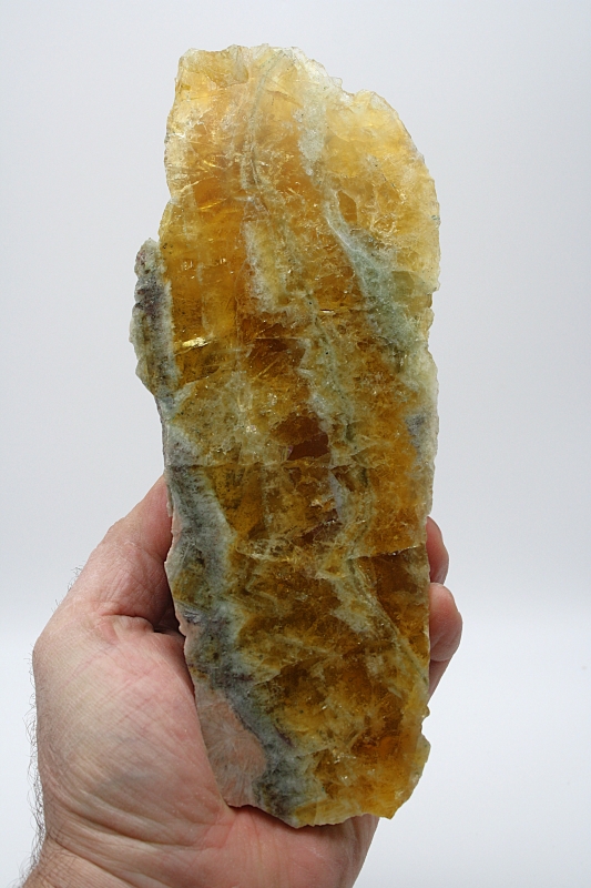 Dieses polierte Endstück zeigt ein Fluoritband von schöner gelber Farbe mit etwas Baryt an der Seite